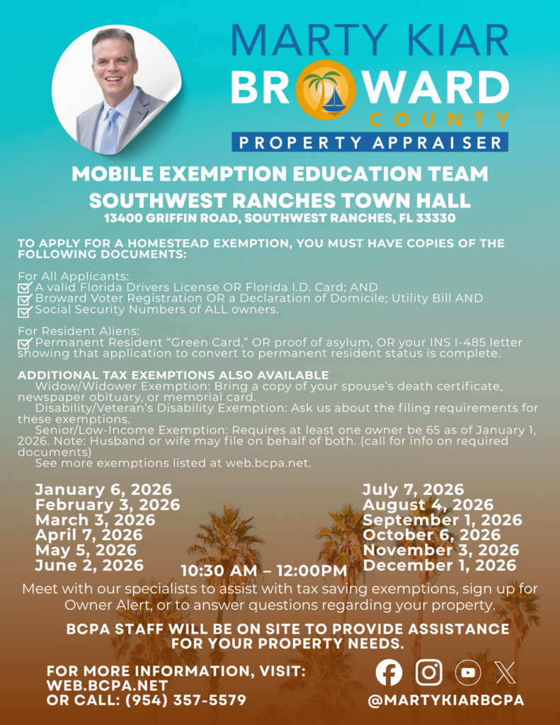 The Broward County Property Appraiser’s Office will be at the Town Hall to help with Homestead, Senior, and other property exemptions.