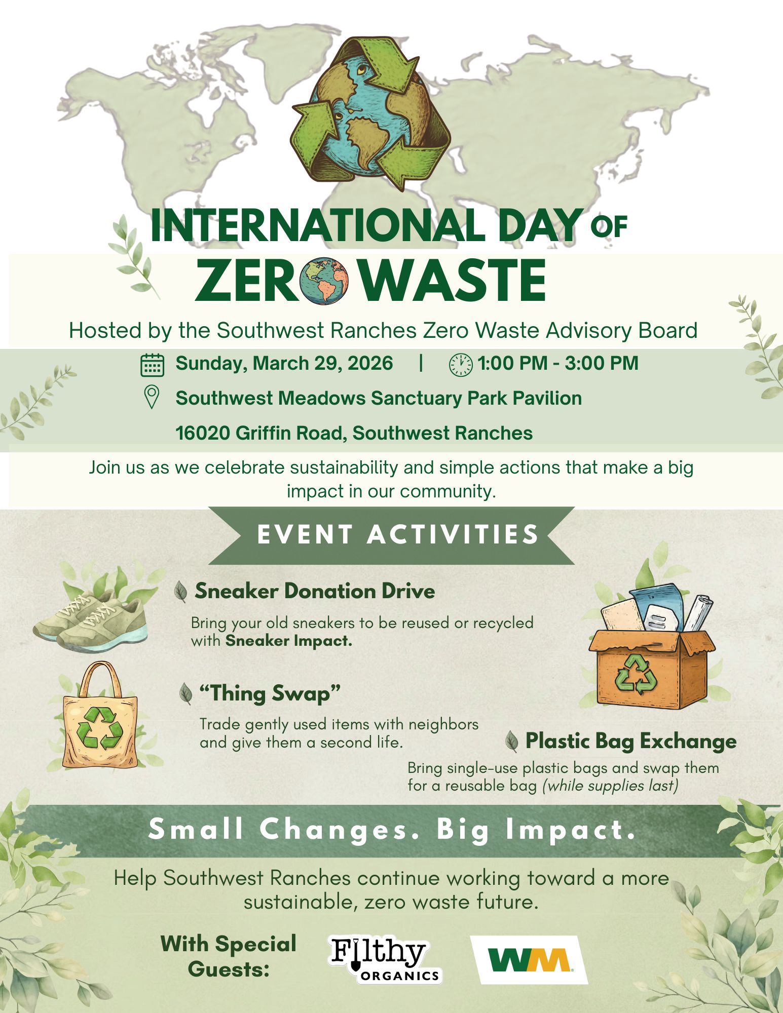 ● March 29th the Town will celebrate International Day of Zero Waste with event at Southwest Meadows Sanctuary Park. Bring your old sneakers to donate to be re-used or recycled, “Thing Swap” to trade unwanted items with others or bring a single use plastic bag to swap for a reusable one.